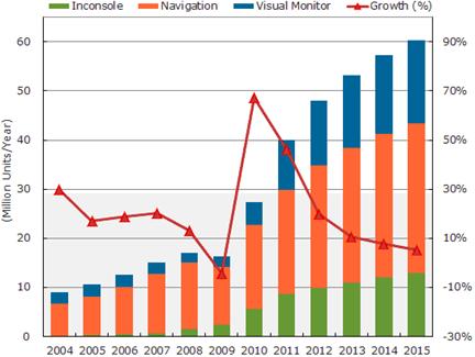 據(jù)NPD DisplaySearch– 平板顯示器于車載的應(yīng)用已經(jīng)越來越盛行,如汽車導(dǎo)航、多功能駕駛儀表盤、以及后座娛樂顯示屏幕等。NPD DisplaySearch預(yù)測(cè)應(yīng)用于車載的面板出貨量將有望從2011年的4千2百萬片成長(zhǎng)到2015年的6千2百萬片。