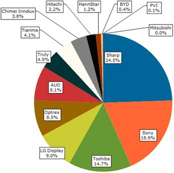 夏普為領(lǐng)先廠商,擁有24.5%的市占率;索尼居次,為18.9%;東芝則有14.7%的市占率。