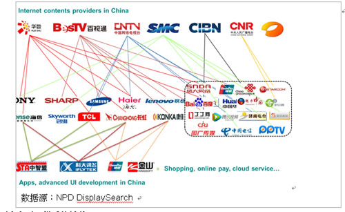 回顧過去近10年平板電視技術的發(fā)展趨勢,初期的5年左右,電視產(chǎn)品技術發(fā)展的重點幾乎都是面板技術,然后慢慢過渡到面板技術和電視其他硬件規(guī)格,現(xiàn)在和未來的重點則更多轉向電視本身規(guī)格、內容和服務?;诔浞值母偁?,中國電視產(chǎn)品技術演進的速度甚至快于歐美和日本市場。以下圖表為主要品牌廠商在智能電視內容和應用發(fā)展的關系圖。