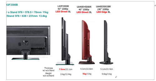 事實上,BMS模式對于品牌廠商而言并非完全出于成本考慮,而更側重于產(chǎn)品的差異化,以及品牌廠商將對渠道和消費者的理解體現(xiàn)在具體產(chǎn)品上,這對于提升品牌廠商終端產(chǎn)品競爭力而言至關重要。因此,我們可以發(fā)現(xiàn),從2010年起,幾乎所有一線品牌廠商新增的系統(tǒng)組裝產(chǎn)品均為BMS模式。以下為TCL在BMS模式下生產(chǎn)的直下式的LED電視在基本外觀尺寸上與Samsung最新推出的直下式產(chǎn)品對比。從相關的指標來看,中國本土品牌在BMS一體化制造的能力已經(jīng)取得了非常大的進步,甚至領先一步。