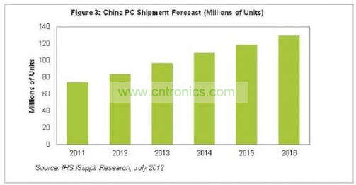 2012年中國(guó)市場(chǎng)的PC出貨量預(yù)計(jì)達(dá)到8360萬(wàn)臺(tái),比去年的7390萬(wàn)臺(tái)增長(zhǎng)13%。至少?gòu)?008年以來(lái),中國(guó)臺(tái)式電腦與筆記本的國(guó)內(nèi)出貨量一直保持兩位數(shù)的強(qiáng)勁增長(zhǎng),預(yù)計(jì)這種健康勢(shì)頭還將再保持兩年,直到2015年溫和放緩至9%。