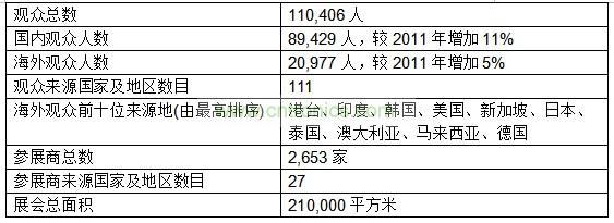 第十七屆「廣州國(guó)際照明展覽會(huì)」展覽面積達(dá)21萬(wàn)平方米,規(guī)模較2011年增長(zhǎng)5%,參展企業(yè)2653家,比上屆減少9%,參展企業(yè)來(lái)自全球27個(gè)國(guó)家和地區(qū)。本屆展會(huì)觀眾數(shù)目同創(chuàng)新高,吸引了110,406名觀眾,較2011年增長(zhǎng)10%,分別來(lái)自111個(gè)國(guó)家及地區(qū),其中國(guó)內(nèi)專業(yè)觀眾89,429人,較2011年增加11%,海外專業(yè)觀眾20,977人,較2011年增加5%,海外觀眾前十位來(lái)源地分別是港澳臺(tái)地區(qū)、印度、韓國(guó)、美國(guó)、新加坡、日本、泰國(guó)、澳大利亞、馬來(lái)西亞和德國(guó)。大會(huì)同期舉辦的各類技術(shù)研討會(huì)、產(chǎn)業(yè)高峰論壇、產(chǎn)品推介會(huì)、交易節(jié)等高水平會(huì)議、論壇交流活動(dòng)多達(dá)110多場(chǎng)次,較去年增加10場(chǎng),亦創(chuàng)新高。