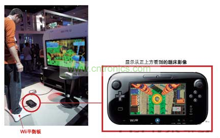 除了改變用戶立場來玩的游戲之外,任天堂還以使用雙屏幕實現(xiàn)更具臨場感的游戲體驗為目標。“Wii Fit U”中的蹦床游戲“Trampoline Target”就是一個很好的例子(圖4)。可將體重計式控制器“Wii平衡板”當做蹦床來操作。在平衡板旁邊的地板上放置的GamePad的畫面上,會顯示從正上方俯視蹦床的影像,蹦得越高蹦床就會變得越小,越接近蹦床就變得越大。這種顯示方法可使用戶感覺像自己真的在蹦床上彈跳一樣。