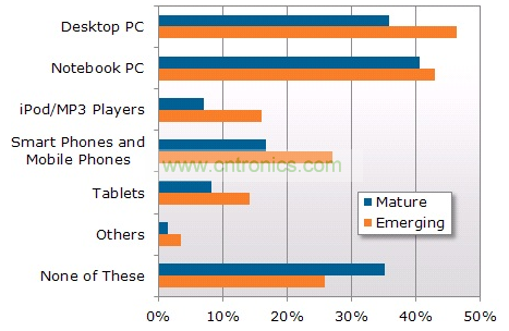 NPD DisplaySearch全球電視消費(fèi)者換機(jī)調(diào)查還對家庭戶進(jìn)行了關(guān)于在其他設(shè)備上收看電視視頻節(jié)目的調(diào)研,發(fā)現(xiàn)在新興市場越來越多的家庭使用除電視以外的設(shè)備,包括平板電腦、智能手機(jī)和MP3播放器。