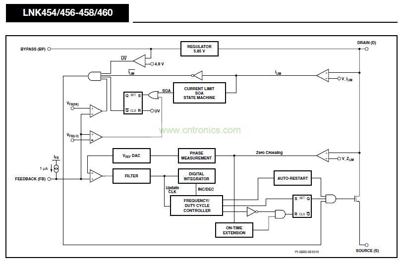 LinkSwitch-PL在一個器件上集成了一個高壓功率MOSFET開關(guān)及一個電源控制器。該IC器件提供單級功率因數(shù)校正和LED電流控制。LinkSwitch-PL控制器包括一個振蕩器、反饋(檢測及邏輯)電路、5.85 V穩(wěn)壓器、遲滯過熱保護(hù)、頻率抖動、逐周期限流、環(huán)路補(bǔ)償電路、自動重啟動、開關(guān)導(dǎo)通時間延長、功率因數(shù)以及恒流控制電路。