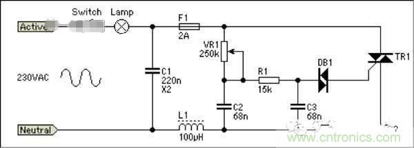 如圖所示,前部分L1、C1是RF抑制電路, VR1、R1、C2、C3構成RC電路,當RC充電電壓大于DB1(DIAC)導通電壓時,DB1導通,觸發(fā)TR1(TRIAC)導通,這時220V電壓 加在燈泡上,當電流過零時,TR1關斷。如此重復。通過改變VR1電位計的大小可以改變時間常數(shù)RC,進而改變導通角。即我們斬波的寬度。