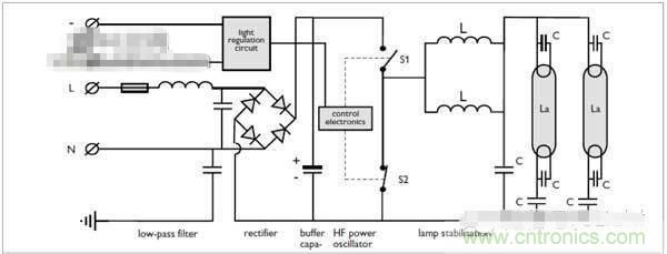熒光燈的調光(1-10V)熒光燈的調光是在高頻電子鎮(zhèn)流器的基礎上研發(fā)出來的。下面是高頻電子鎮(zhèn)流器的線路圖: