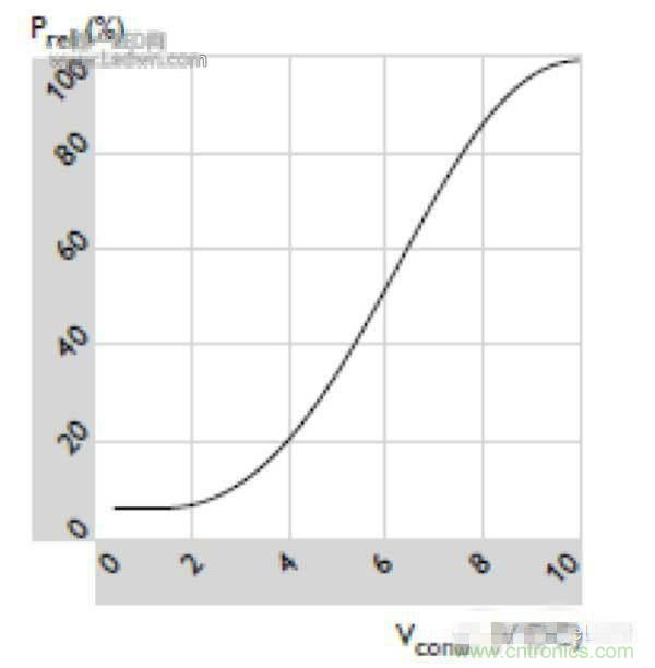 6)調光范圍0.1%-100%,最低限值取決于供應商,調光曲線標準化且適應人眼的敏感度(下圖:對數(shù)調光曲線);