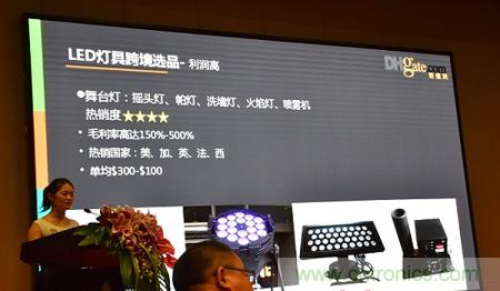 【導(dǎo)讀】周慧榮現(xiàn)場表示,敦煌網(wǎng)的數(shù)據(jù)顯示,2013-2014年海外買家對中國LED燈具采購快速增長,2015年上半年LED燈具海外采購總體增長開始放緩,但是LED燈具中的燈管、球泡、筒燈等受到海外買家歡迎,室內(nèi)照明燈具、舞臺燈、植物生長燈等利潤高,隨著采購?fù)镜絹恚掳肽暝龇型麤_高。
