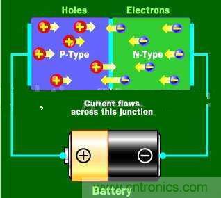 為了除掉損耗區(qū)就必須使N型向P型移動(dòng)和空穴應(yīng)反向移動(dòng)。為了達(dá)到目的,連接二極管N型一方到電流的負(fù)極和P型就連接到電流的正極。這時(shí)在N型物質(zhì)的自由電子會(huì)被負(fù)極電子排斥和吸引到正極電子。在P型物質(zhì)中的電子空穴就移向另一方向。當(dāng)電壓在電子之間足夠高的時(shí)候,在損耗區(qū)的電子將會(huì)在它的電子空穴中和再次開始自由移動(dòng)。損耗區(qū)消失,電流流通過二極管。