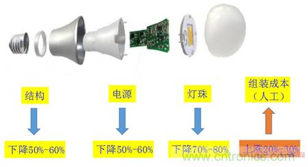 從上圖表示,LED光源產(chǎn)品無論是從結(jié)構(gòu),電源還是燈珠,成本都有大幅下降至少50%,然而人工組裝成本卻漲幅近20%-30%。晶豐明源銷售總監(jiān)李寧在第六屆華強國際LED照明市場戰(zhàn)略暨創(chuàng)新技術(shù)研討會上表示:“晶豐明源將持續(xù)提供更高性價比的整體電源方案來提高客戶的競爭力,其次,實現(xiàn)全自動化生產(chǎn),提高效率,從而幫助客戶降低人工成本。”