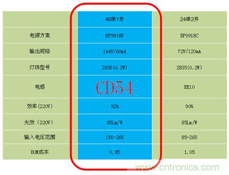 從上圖各種參數(shù)對比我們可以看出,單從成本來看,一定是線性方案最低,但同時會存在一些問題,比如光效,效率并不是很理想,最關(guān)鍵的一點,線性方案溫度較高,因為鋁基板溫度高而造成的硫化而存在一定的風(fēng)險。所以,從整體參數(shù)對比來看,66串1并的方案是性價比最高的。同理,8W T管方案推薦的是單串1并BP9918B的方案,單片集成工藝,集成啟動電阻,極簡的外圍電路,系統(tǒng)成本極具競爭力,其中值的一提的是該方案采用了CD54電感,可將BOM成本可以做到大概在0.85左右,且可以實現(xiàn)全貼片的方案,從而幫助客戶降低人工成本。