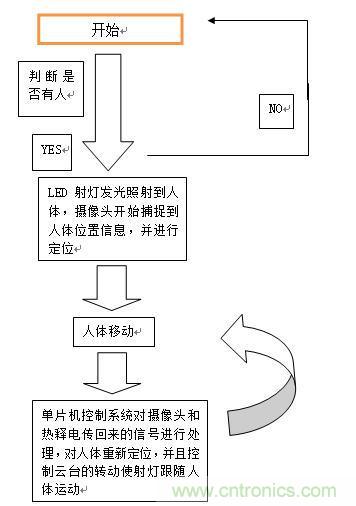 系統(tǒng)初始化之后,對(duì)狀態(tài)進(jìn)行判斷,若沒(méi)檢測(cè)到人,則一直處于檢測(cè)狀態(tài);若檢測(cè)到有人,則單片機(jī)控制IO口打開開關(guān)使得LED射燈發(fā)光照射到人體,攝像頭開始捕捉人體位置信息,并進(jìn)行定位;當(dāng)人體移動(dòng)時(shí),單片機(jī)控制系統(tǒng)對(duì)熱釋電和攝像頭傳回來(lái)的信號(hào)進(jìn)行處理,對(duì)人體重新進(jìn)行定位,并且控制云臺(tái)轉(zhuǎn)動(dòng)使射燈跟隨人體運(yùn)動(dòng);當(dāng)人體再移動(dòng),便繼續(xù)“人體移動(dòng)----數(shù)據(jù)處理---轉(zhuǎn)動(dòng)云臺(tái)”這個(gè)循環(huán)過(guò)程。