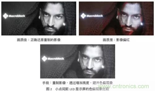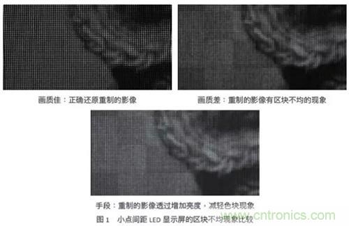 在室內(nèi)應用中,LED顯示屏的亮度多介于300到1000尼特(nit),將此亮度轉(zhuǎn)換成LED順向電流,約當于1~5mA,甚至小于1mA。因此,驅(qū)動芯片的小電流集中度變得很重要。當驅(qū)動芯片電流精度不佳,小點間距LED顯示屏就容易出現(xiàn)區(qū)塊不均的色塊,然而為掩飾色塊這個缺陷,通常會采取提高LED電流這個手段,來增加顯示屏的亮度。但帶來的缺點是,當觀眾注視這個LED顯示屏一段時間后,眼睛容易感覺不適。圖1所演示的是小點間距LED顯示屏,在使用不同質(zhì)量的LED驅(qū)動芯片時,重制圖像后的實際差異。