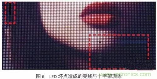 現(xiàn)今的LED磊晶與封裝技術(shù)與日俱增,但LED經(jīng)過長時間的使用后仍難免會有損壞,與液晶屏幕不同的是,壞掉的LED會在小點間距LED顯示屏形成亮線或是十字架,而不是一個黑點,如圖6所示。對LED顯示屏制造商,營運商與觀眾而言,都是一大困擾。
