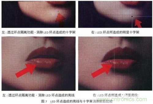 一個好的小點間距LED顯示屏必須要能消除因LED壞點所造成惱人的亮線或十字架現(xiàn)象,如圖7左圖所示。唯有采用具有“壞點隔離”功能(dead pixel isolation)的LED驅(qū)動芯片,才能維持小點間距LED顯示屏的正常運作,并可方便用戶彈性安排維修時程。