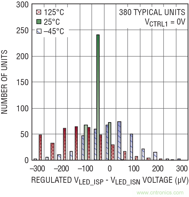 圖 1:VCTRL = 0V 時,LT3744 中的 LED 電流調(diào)節(jié)放大器之典型失調(diào)電壓為 ±300µV