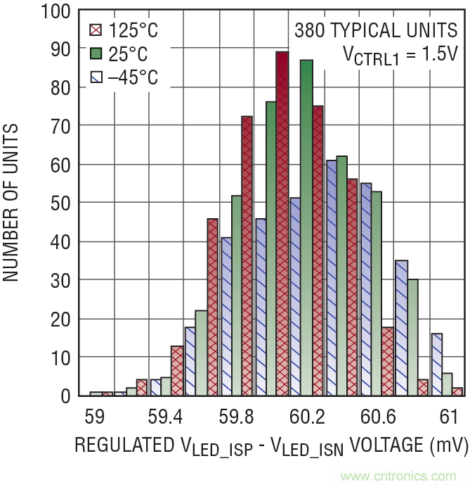 圖 1 顯示了當(dāng)模擬控制輸入為 0V 時,隨溫度變化 LT3744 失調(diào)電壓的生產(chǎn)一致性,在這里,典型器件數(shù)量為 380 個。憑借誤差放大器的低失調(diào),控制環(huán)路在 1/20 標(biāo)度模擬調(diào)光時,能夠?qū)崿F(xiàn) ±10% 的典型準確度。圖 2 顯示了當(dāng)控制輸入等于 1.5V 時,穩(wěn)定電壓在多個 LED 電流檢測引腳上的分布。滿標(biāo)度范圍的準確度好于 ±3%,這相當(dāng)于在 60mV 滿標(biāo)度調(diào)節(jié)電壓時準確度為 ±1.8mV。