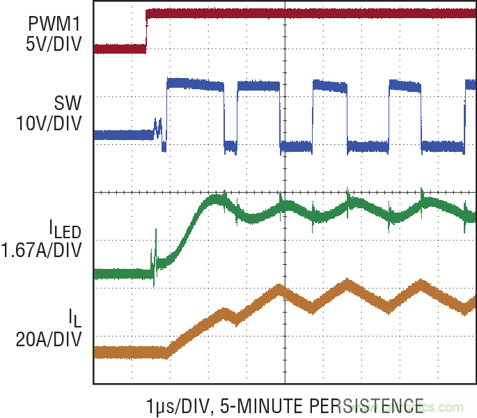 衡量 LED 驅(qū)動器性能的最重要指標(biāo)之一是 LED 電流在 PWM 調(diào)光時的恢復(fù)速度。在 PWM 接通信號上升沿之后的頭幾個開關(guān)周期中,驅(qū)動器的表現(xiàn)對最終產(chǎn)品的質(zhì)量有很大影響。LT3744 采用專有 PWM、補償和時鐘同步技術(shù),提供無閃爍性能,甚至在驅(qū)動 LED 至 20A 電流時也是如此。