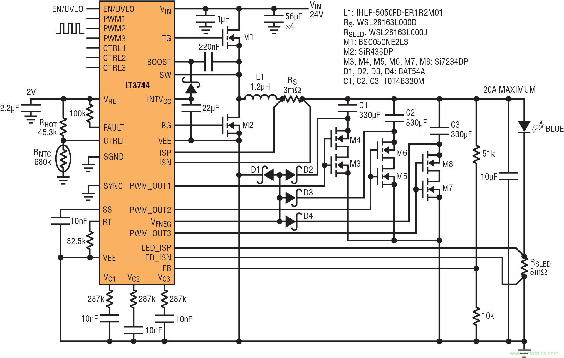 一個具備新式功率 MOSFET 的高效率大電流 LED 驅(qū)動器控制器可以提供大約 200W (解決方案尺寸大約為 4cm2),并可將所有電源通路組件的溫度限制到低于 80ºC。就高于 200W 的 LED 負載而言,LT3744 可以并聯(lián),以限制任何組件的溫度上升。所有補償輸出都應(yīng)該并聯(lián),以允許轉(zhuǎn)換器之間的均流。