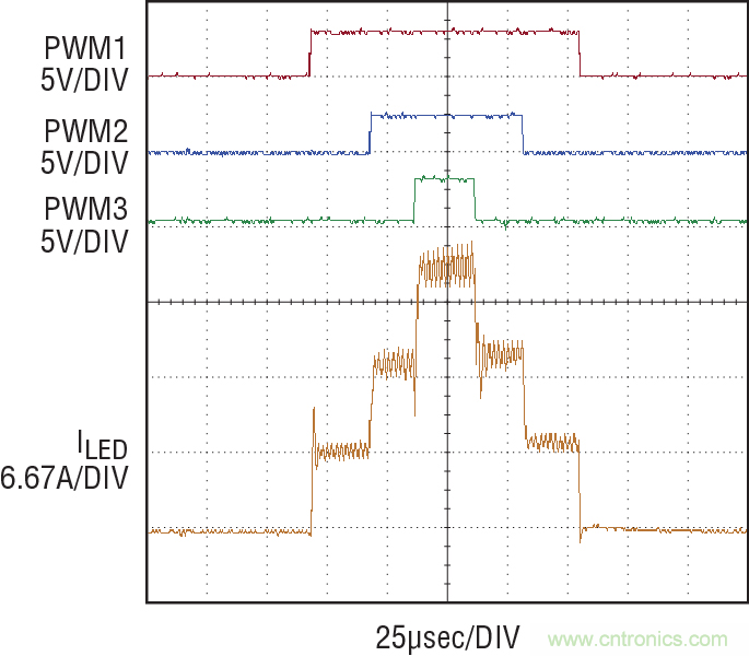 3 種不同電流狀態(tài)之間的 PWM 調(diào)光如圖 5 和圖 6 所示。在圖 5 中,PWM 信號順序接通和斷開。PWM3 的優(yōu)先級最高,PWM1 則最低。這允許單一輸入信號快速轉(zhuǎn)換,以改變輸出電流。如圖 6 所示,PWM 輸入信號之間可以有任意長短的時間間隔。