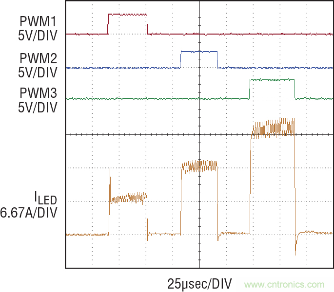 圖 5:LT3744 在 3 種穩(wěn)定電流狀態(tài)之間轉(zhuǎn)換,斷開時間不到 3 個開關(guān)周期。