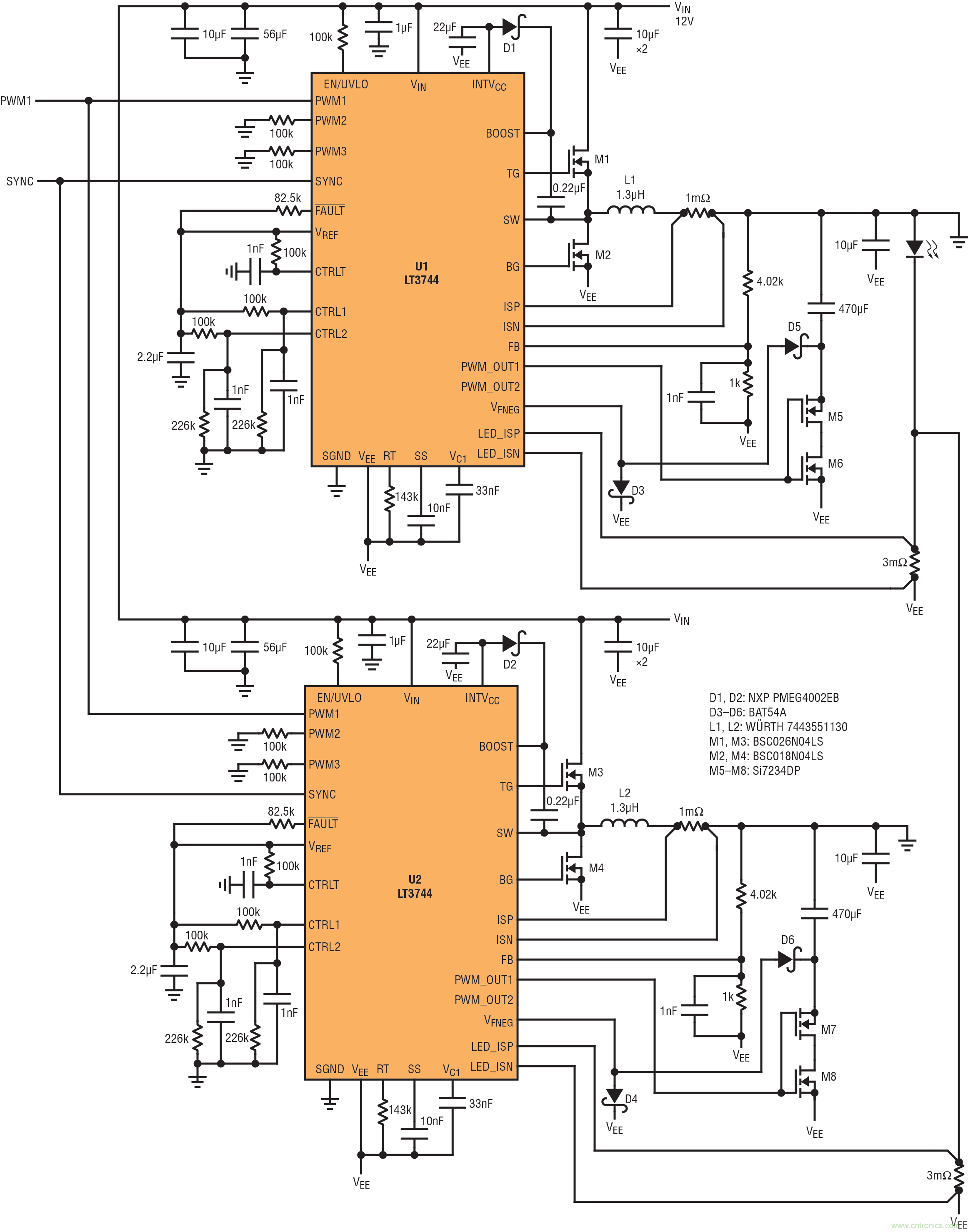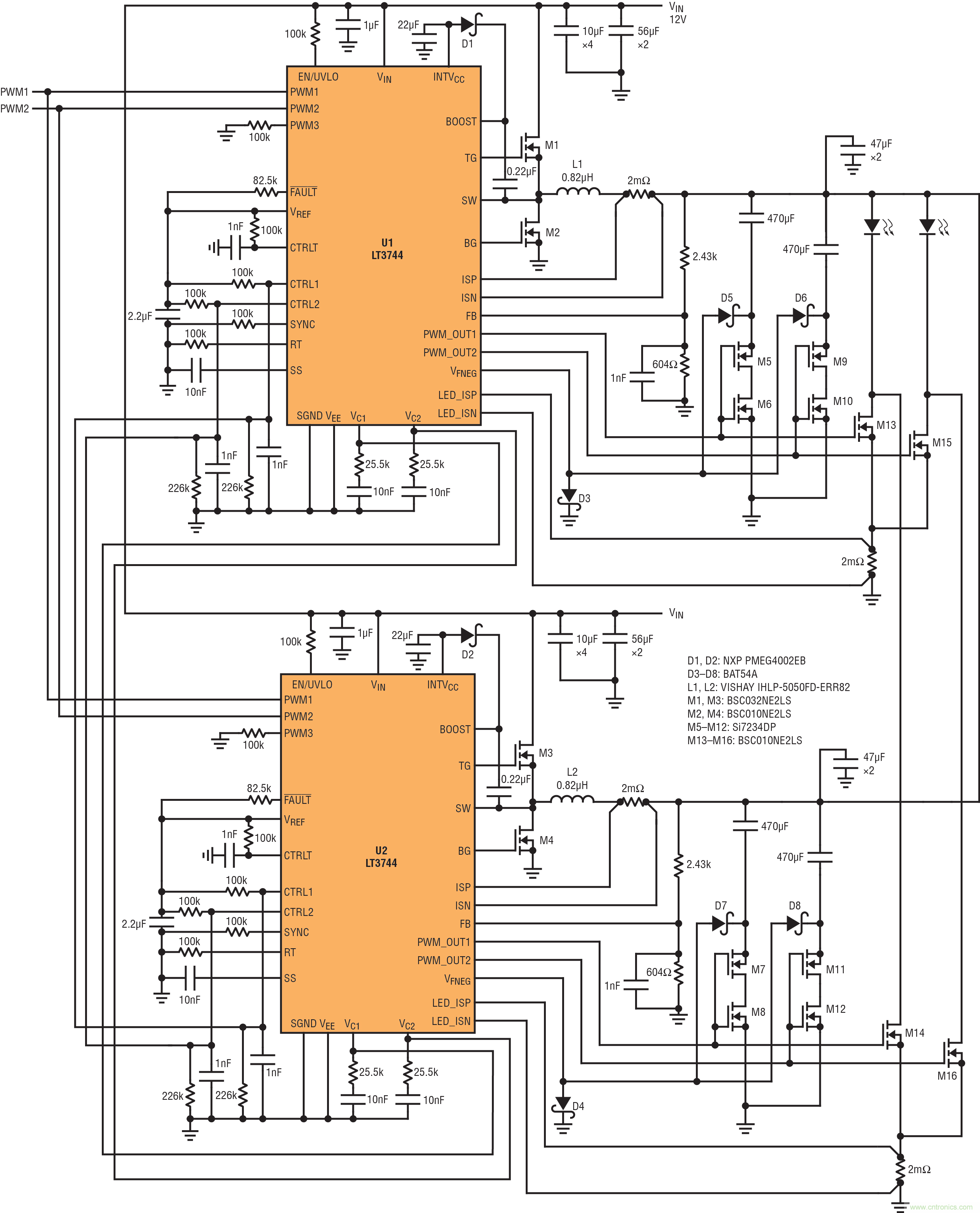 兩個 LT3744 LED 驅(qū)動器并聯(lián)以組成 324W 雙 LED 驅(qū)動器