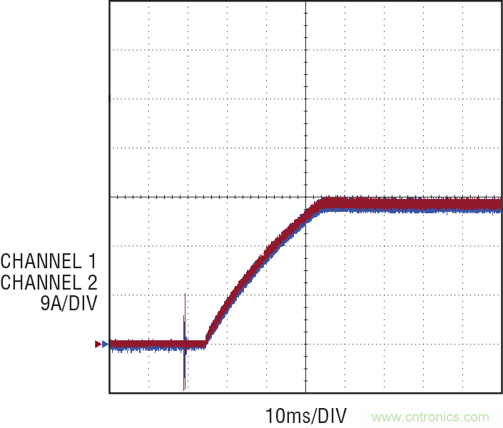 圖 8 顯示了一款 324W 轉(zhuǎn)換器,由兩個ADI DC2339A 演示電路板并聯(lián)組成。在這款設(shè)計中,每個并聯(lián)的控制器都產(chǎn)生 27A 電流,總共產(chǎn)生 54A 電流,電壓為 6V。通過將相應(yīng)的補償輸出連接到一起,兩個控制器協(xié)調(diào)一致地運行,以提供平滑、良好的啟動和準確的 DC 調(diào)節(jié)。