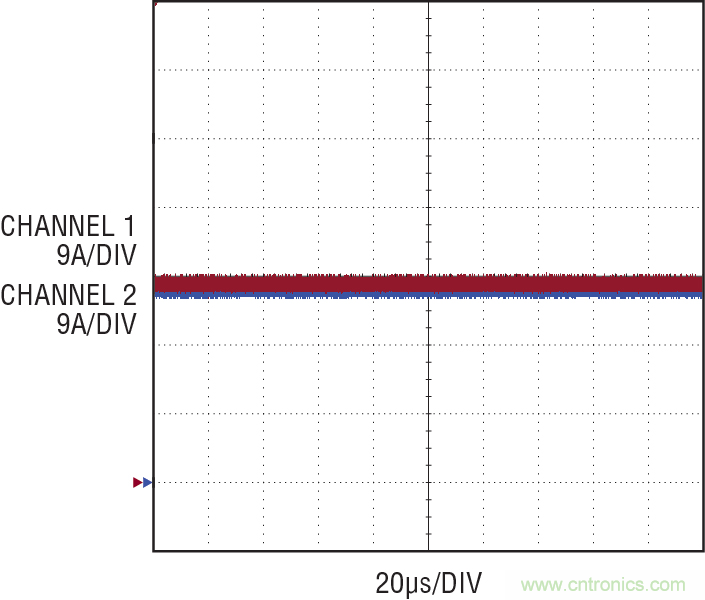 圖 10:在滿負載時 LED DC 電流均分,兩個并聯(lián)驅(qū)動器之間的電流差別非常小。