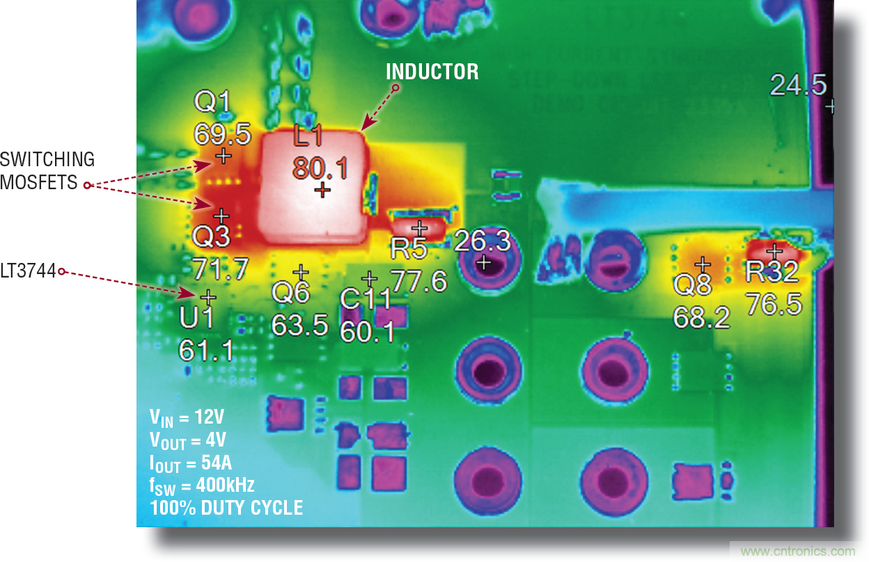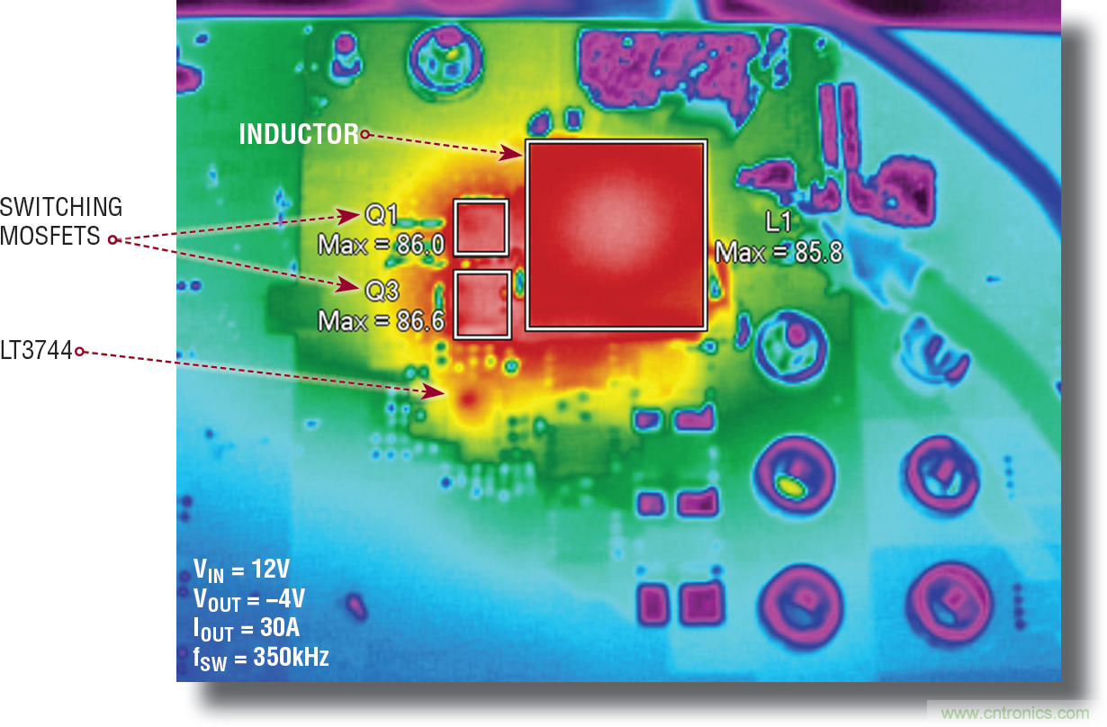圖 15 顯示,向并聯(lián)負輸出降壓-升壓型應(yīng)用中的 LED 提供 30A 電流時,組件溫度的上升情況。