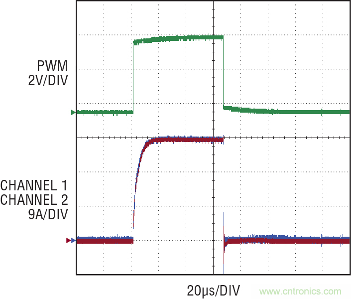 圖 12:在進行 PWM 調(diào)光時,LT3744 的并聯(lián)驅(qū)動器之間實現(xiàn)了出色的 LED 電流均分。