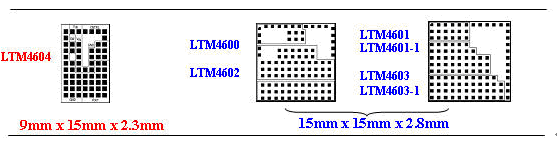 由于 LTM4604 以較低電壓和較低功率工作,因此這個器件采用了更小和更薄的 LGA 封裝,與第一個系列的器件相比,LTM4604 占板面積小 40%,薄 18%。第一個系列的器件具有更高的功率和更高的電壓(LTM4600、LTM4601 和 LTM4603)。圖 2 比較了這些器件的相對尺寸(占用面積)。