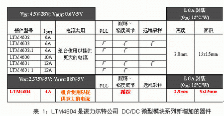 爾特公司推出的最新 DC/DC 微型模塊(µModuleTM)穩(wěn)壓器,LTM4604 也引出了一個面向低壓應(yīng)用(2.375V 至 5V)的新器件系列。第一個器件系列由 6 個 DC/DC 微型模塊穩(wěn)壓器組成,以較高電壓和較高功率的應(yīng)用為目標,而新推出的器件系列專門用于較低電壓和功率略低一些的應(yīng)用。此外,新器件系列采用的封裝小 40%。參見表 1,以迅速了解這些緊湊和完整的 DC/DC 系統(tǒng)的特色。