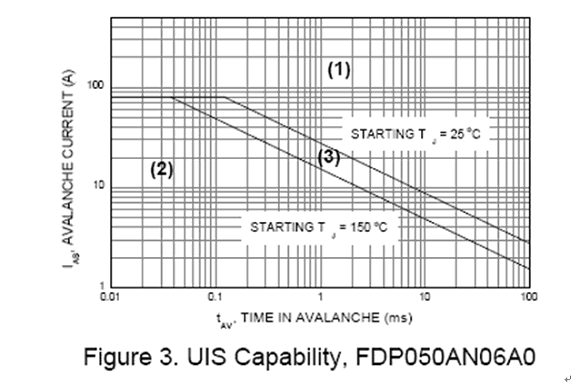 UIS 的評(píng)估方式是針對(duì)崩潰現(xiàn)象分析的一種很有用的方法。在圖三 UIS 安全工作區(qū)域中可區(qū)分為三大區(qū)域 (1) 大于 25 ° C 線或者是圖中靠右的區(qū)域 , (2) 低于 150 ° C線或者是圖中靠左的區(qū)域 , (3) 介于 (1) 與 (2) 的區(qū)域。其中 (1) 可清楚地了解此組件工作超出額定工作范圍之外 (2) 則是位于額定工作范圍之內(nèi)。至于 (3) 的區(qū)域界定 我們需要得到此組件的起始 UIS 接合面溫度以決定其工作能力。稍后會(huì)在后面舉例說明如何求出此接合面溫度。