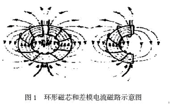 在環(huán)形共模電感的特殊場合中,每條引線中的差模電流密度可假定是相等的,且方向相反。由此而產(chǎn)生的磁場必定在環(huán)形磁芯周邊上的總和為零,而在其外部的總和則不為零。