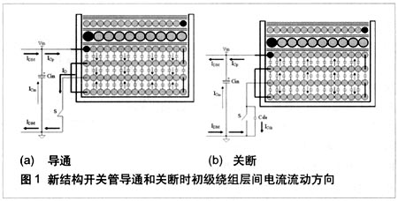 對(duì)于常規(guī)的4層初級(jí)繞組結(jié)構(gòu),在開關(guān)管導(dǎo)通和關(guān)斷的過程中,層間的電流向同一個(gè)方向流動(dòng)。在圖1中,在開關(guān)管導(dǎo)通時(shí),源極接到初級(jí)的地,B點(diǎn)電壓為0,A點(diǎn)電壓為Vin,基于電壓的變化方向,初級(jí)繞組層間電容中電流流動(dòng)方向向下,累積形成的差模電流值大。在功率器件關(guān)斷瞬間,MOSFET漏-源極電容充電,變壓器初級(jí)繞組的層間電容放電,這兩部分電流也會(huì)形成差模電流。同樣,基于電壓的變化方向,初級(jí)繞組層間電容中的電流流動(dòng)方向向上,累積形成的差模電流值大。