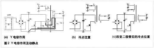 共模電流在輸入及輸出線與大地間流動(dòng),主要有下面幾部分:通過MOSFET源級(jí)到大地的電容Cde。如果改進(jìn)IC的設(shè)計(jì),如對(duì)于單芯片電源芯片,將MOSFET源極連接到芯片基極,用于散熱,而不是用漏極進(jìn)行散熱,這樣可以減小漏極對(duì)大地的寄生電容。PCB布線時(shí)減小漏極區(qū)銅皮的面積可減小漏極對(duì)大地的寄生電容,但要注意保證芯片的溫度滿足設(shè)計(jì)的要求;通過Cm 和Cme產(chǎn)生共模電流;通過Ca和 Cme產(chǎn)生共模電流;通過Ct和Coe產(chǎn)生共模電流;通過Cs和Coe產(chǎn)生共模電流,這部分在共模電流中占主導(dǎo)作用。減小漏極電壓的變化幅值及變化率可減小共模電流,如降低反射電壓,加大漏-源極電容,但這樣會(huì)使MOSFET承受大的電流應(yīng)力,其溫度將增加,同時(shí)加大漏-源極電容,產(chǎn)生更強(qiáng)的磁場(chǎng)。如果系統(tǒng)加了Y電容,如圖2所示,通過Cs的大部分共模電流被Y 電容旁路,返回到初級(jí)的地,因?yàn)閅電容的值大于Coe。Y電容必須直接并用盡量短的直線連接到初級(jí)和次級(jí)的冷點(diǎn)。如果導(dǎo)通時(shí)MOSFET的dV/dt大于關(guān)斷時(shí)的值,Y電容則連接到初級(jí)的地,反之連接到Vin。