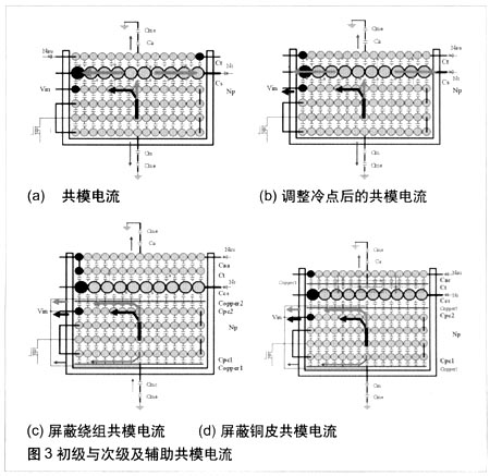 如果在內(nèi)層及初級(jí)、次級(jí)繞組間放置銅皮,銅皮的寬度小于或等于初級(jí)繞組的寬度,銅皮的中點(diǎn)由導(dǎo)線連到冷點(diǎn),如圖3(c)所示,由于銅皮為冷點(diǎn),與其接觸的繞組和銅皮間電壓的擺率降低,從而減小共模電流,同時(shí)將共模電流由銅皮旁路引入到冷點(diǎn)。注意銅皮的搭接處不能短路,用絕緣膠帶隔開,內(nèi)外層銅皮的方向要一致。輔助繞組和次級(jí)繞組的共模電流可以由以下方法補(bǔ)償:① 加輔助屏蔽繞組:輔助屏蔽繞組繞制方向與次級(jí)繞組保持一致,輔助屏蔽繞組與次級(jí)繞組的同名端連接到一起,并連接到冷點(diǎn),輔助屏蔽繞組的另一端浮空。由于它們的電壓變化的方向相同,所以兩者間沒有電流流動(dòng)。②加外層的輔助屏蔽銅皮:輔助屏蔽銅皮的中點(diǎn)連接到輔助繞組的中點(diǎn)。同樣,基于電壓的變化方向分析電流的方向,可以看到,兩者之間的電流形成環(huán)流,相互補(bǔ)償?shù)窒?,從而降低共模電流?br />