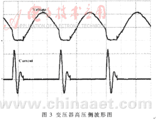 研制的高壓窄脈沖電源改善了高壓荷電系統(tǒng)的性能且穩(wěn)定性好。實(shí)際運(yùn)行表明,電源輸出電壓峰值為0~30kV,頻率為15kHz,脈寬為500ns~800ns。脈沖供電與直流供電相比,其起暈電壓低50%以上。此種電源功率變壓器的輸入頻率大幅度提高,同時(shí)變壓器和平波電抗器體積重量大為減小,且電源輸出紋波小、響應(yīng)速度快。變壓器高壓側(cè)波形如圖3所示。