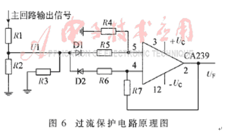 過(guò)電流保護(hù)電路的主要任務(wù)是檢測(cè)輸出電流的變化,并將其反饋到SG3525的控制端,在電流較大時(shí)可可靠關(guān)斷系統(tǒng),以避免器件的損壞。其電路原理如圖6所示。圖中,電阻R1、R2對(duì)主電路的輸出進(jìn)行采樣,當(dāng)輸出電路中電流增大到設(shè)定值時(shí),采樣電壓U1隨之增大,該信號(hào)經(jīng)CA239反饋到SG3525的+V端,封鎖PWM脈沖。