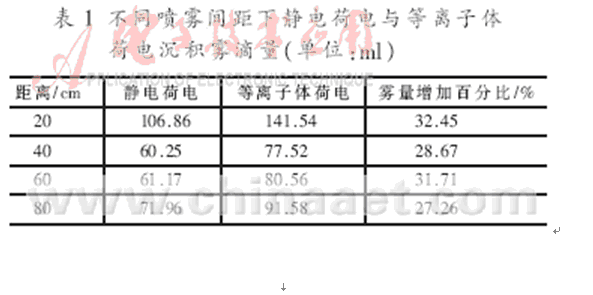 由表1可以看出,由于使用了等離子體荷電噴霧技術(shù),農(nóng)藥落在植株上的藥量有了明顯的增加,達(dá)到了設(shè)計(jì)要求。由表2可見(jiàn),等離子體荷電與普通靜電噴霧相比,能在較小的放電電壓下得到較高的荷質(zhì)比。從而降低了農(nóng)藥的使用量,也減輕了對(duì)環(huán)境的污染。