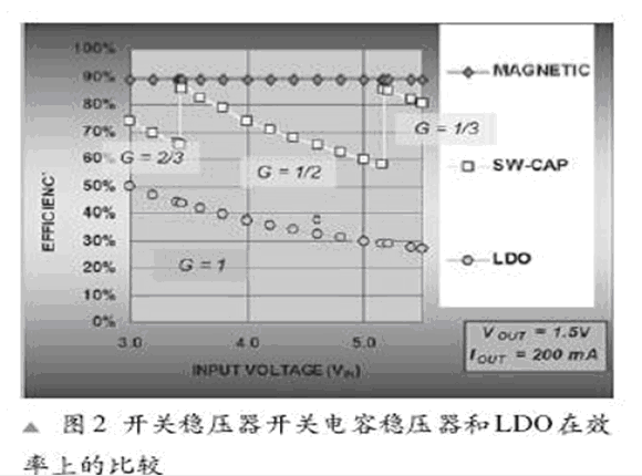 隨著VIN的增長,由轉(zhuǎn)換器產(chǎn)生的VIN和VOUT 間的增量增長引起功率消耗的增長和效率的下降。解決這個(gè)問題的一個(gè)方式是轉(zhuǎn)變成一個(gè)更高的效率增益,就像給汽車替換齒輪一樣。圖2顯示了一個(gè)開關(guān)電容器降壓穩(wěn)壓器,一個(gè)LDO及一個(gè)開關(guān)電容器的效率曲線。開關(guān)電容器具有一個(gè)模擬增益控制和增益變化以保持一個(gè)給定負(fù)載效率的持續(xù)性。開關(guān)電容器并具有離散增益步驟,由VOUT/(增益 *VIN)與離散增益來決定效率的高低。一個(gè)LDO僅有1的增益及三者中最低的效率。開關(guān)電容器(SC)穩(wěn)壓器則有三個(gè)不同的電壓增益(2/3,1/2和1/3)。我們可以看到,開關(guān)電容穩(wěn)壓器隨著VIN 的增長,電壓增益從2/3轉(zhuǎn)到1/2以及從1/2到1/3,因此整個(gè)負(fù)載范圍的效率達(dá)到最大化。這就帶來了在Li-ion 范圍上(3.4V到3.8V)80%的效率。在相同應(yīng)用中的一個(gè)LDO僅能達(dá)到50%的效率。根據(jù)電感器種類,一個(gè)典型的開關(guān)穩(wěn)壓器大約具有88-90%的效率。
