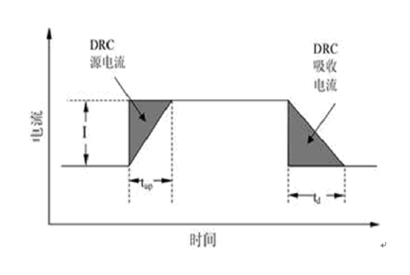 假定DRC電路遠(yuǎn)遠(yuǎn)快于變換器,則DRC的工作時間取決于DC/DC變換器的電流改變速率Sr,并可分為不同的電流上升速率(Sru)及下降速率(Srd)?,F(xiàn)在,我們研究一個負(fù)載電流脈沖期間