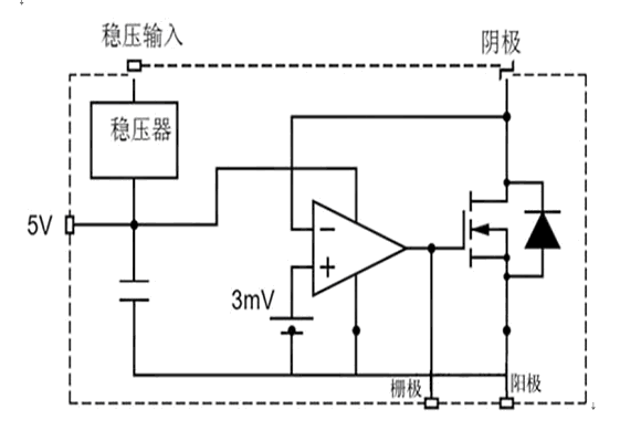 實現(xiàn)與兩端整流器功能相當(dāng)?shù)钠骷?,必須包括一個MOSFET,一個控制該器件以及內(nèi)部偏置電源的非??焖偾曳浅C舾械碾娐?。這樣的電路如圖1所示。