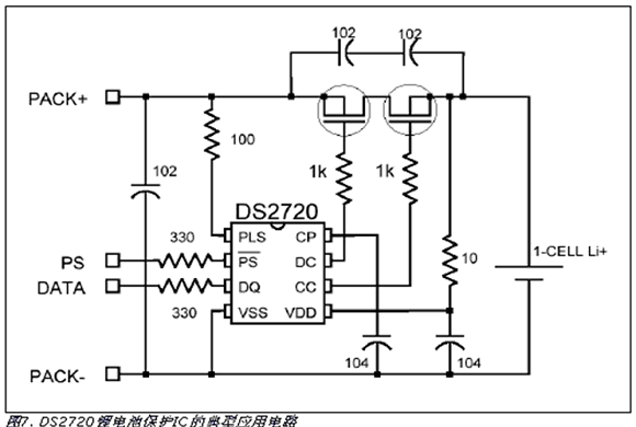 因?yàn)長i+電池過充或過放可能會導(dǎo)致爆炸并造成人員傷害,所以使用這類電池時,安全是主要關(guān)心的問題。因此,商用鋰離子電池組通常包括象DS2720這樣的保護(hù)電路(圖7)。