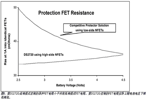 DS2720IC使用外部開關(guān)元件,如低成本n溝道功率MOSFET,來控制充電和放電電流。內(nèi)部9V的電荷泵為外部n溝道MOSFET提供高端驅(qū)動,與常見使用相同F(xiàn)ET的低端保護(hù)電路相比具有更低的導(dǎo)通電阻。FET導(dǎo)通電阻實(shí)際上隨電池放電而減少(見圖8)。