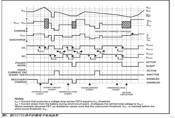 b 欠壓 如果在VDD檢測的電池電壓低于欠壓閾值VUV時間大于欠壓延遲時間tUVD,則DS2720關(guān)閉充電和放電FET,并將保護(hù)寄存器的UV置位,使其進(jìn)入休眠模式。當(dāng)電池電壓升到VUV以上和連接充電器后,IC打開充電和放電FET。