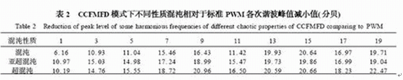 從表中給出的以標(biāo)準(zhǔn)周期PWM前19次諧波為參照的數(shù)據(jù)可以看出,分別在混沌、亞超混沌及超混沌信號(hào)調(diào)制下,各次諧波對(duì)應(yīng)處的頻譜數(shù)值都得到了明顯的降低。在混沌信號(hào)調(diào)制下,諧波對(duì)應(yīng)處的頻譜數(shù)值平均降低14.87分貝(dB);在亞超混沌信號(hào)調(diào)制下,諧波對(duì)應(yīng)處的頻譜數(shù)值平均降低16.84分貝(dB);在超混沌信號(hào)調(diào)制下,諧波對(duì)應(yīng)處的頻譜數(shù)值平均降低17.86分貝(dB)。若以歐盟(89/336/EEC指令)電磁兼容性導(dǎo)則中限制設(shè)備輸入電流諧波分量最大值幅度這一原則,來討論不同性質(zhì)混沌信號(hào)降低電磁干擾水平的效果,結(jié)論非常明顯,即以超混沌信號(hào)作為開關(guān)調(diào)制信號(hào)源,比混沌能更好地降低電磁干擾水平。