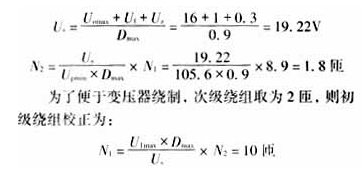 計(jì)算原副邊繞組匝數(shù):按輸入電壓最低及輸出滿載的情況(此時(shí)占空比最大)來(lái)計(jì)算原副邊繞組匝數(shù),已知Umin=176V經(jīng)整流濾波后直流輸入電壓Udmin=1.2×176=211.2V。