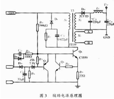 輔助電源采用RCC變換器(RingingChokeConverter),見(jiàn)圖3。其輸入電壓為交流220V整流濾波電壓,輸出直流電壓為12.5V,輸出直流電流為0.5A。電路中Q8和變壓器初級(jí)繞組線圈N1與反饋繞組線圈N3構(gòu)成自激振蕩。R72為啟動(dòng)電阻。Q9、R77構(gòu)成輔助電源初級(jí)過(guò)流保護(hù)。D20、C81、ZD1、Q11、R75、R76構(gòu)成電壓檢測(cè)與穩(wěn)壓電路,控制Q8的基極電流的直流分量,從而保持輸出電壓恒定,變壓器采用EE19、LP3材質(zhì)構(gòu)成。初級(jí)180匝,反饋繞組5.5匝,次級(jí)11匝,初級(jí)電感量是2.6mH,磁芯中間留有間隙0.4mm。
